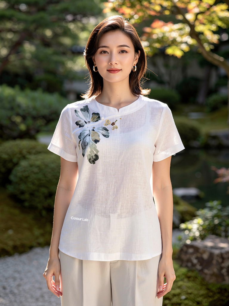 Detail: modern mandarin collar neck, short sleeves, hidden zip closure(back)