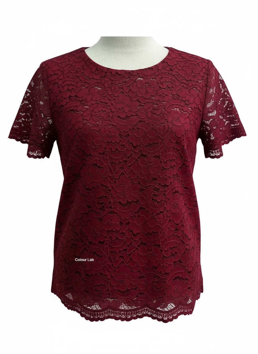 Fabric: Lace Material Fit: Body fit Detail: Crew neck, short sleeves Care: Hand Wash / Machine wash cold, gentle cycle, Do Not Soak Style Code: TS 1109D Measurements: (36)M : Shoulder 37 | Bust 98 | Sleeve 19 | Cuff 34 | Hip 104 | Length 59 (38)L : Shoulder 39 | Bust 106 | Sleeve 19 | Cuff 36 | Hip 110 | Length 60 (40)XL : Shoulder 41 | Bust 108 | Sleeve 20 | Cuff 38 | Hip 116 | Length 61
