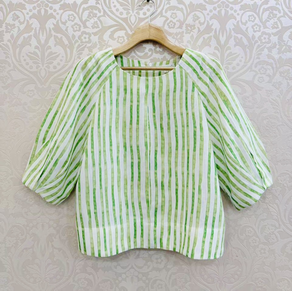 Contemporary three-quarter sleeve top in comfortable linen material, featuring a unique striped design. Material : Premium Linen Price: RM 159 Colour : Leaf Green + White Measurements: (34)S: Bust 98 | sleeve hole 28 | Hip 104 | Length 55 (36)M : Bust 104 | Sleeve Hole 30 | Hip 108 | Length 56 (38)L : Bust 108 | sleeve hole 32 | Hip 114 | Length 57 (40)XL : Bust 112 | sleeve hole 32 | Hip 112 | Length 58 (42)XXL : Bust 118 | sleeve hole 34 | Hip 124 | Length 60