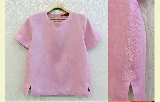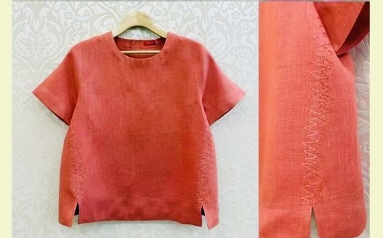 Fabric: 100% Premium Linen Fit: Relaxed fit Detail: Crew neck, short sleeves, and side split with zigzag embroidery. Care: Hand Wash / Machine wash cold, gentle cycle, Do Not Soak Measurements: (34)S : Shoulder 35 | Bust 96 | Sleeve 20 | Cuff 34 | Hip 100 | Length 57 (36)M : Shoulder 38 | Bust 100 | Sleeve 20 | Cuff 36 | Hip 104 | Length 57 (38)L :Shoulder 39 | Bust 104 | Sleeve 21 | Cuff 36 | Hip 110 | Length 58 (40)XL : Shoulder 40 | Bust 108 | Sleeve 22 | Cuff 38 | Hip 116 | Length 60 (42)XXL : Shoulder 42 | Bust 114 | Sleeve 23 | Cuff 40 | Hip 120 | Length 61 (44)3XL : Shoulder 44 | Bust 120 | Sleeve 23 | Cuff 40 | Hip 126 | Length 62